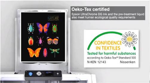 第三:安全可靠:愛普生活的色彩DG涂料墨水通過了Oeko-tex Standard 100的第一級別認證(Report no.N-KEN12143),可以用來制作嬰兒及倆歲以下兒童服裝的織物,原材料和附件,令經營者可以放心的生產,令最終用戶可以安心的使用。