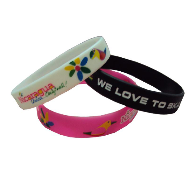 硅膠手飾色澤鮮艷靚麗,可做任何肉眼看得見的顏色,時尚大方,不褪色、不怕水、不怕皺,物美價廉,產品可以絲印,凹印,產品本身可以做成夜光效果。還具有使用壽命長,材料質地柔軟、款式新穎、不刺激手部皮膚等特點。