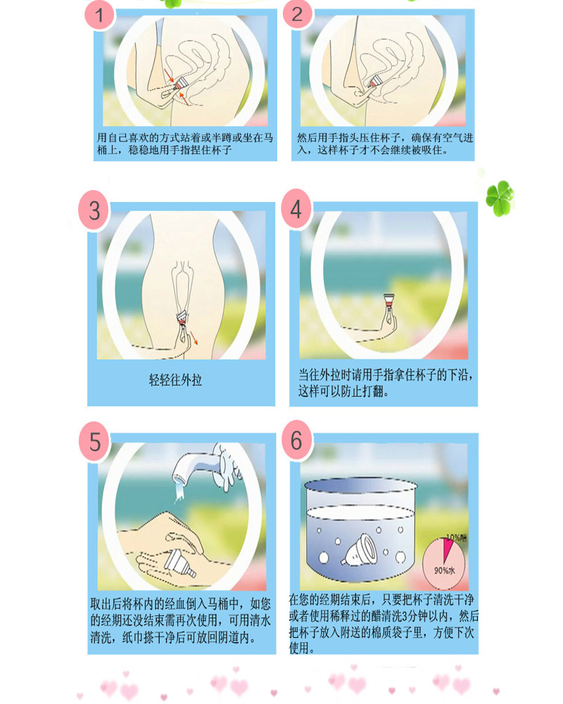 4.當經(jīng)血儲存到一定量時,按自己的實際情況,一般情況第一天將硅膠月經(jīng)杯取出2次即可,量大的一天取出3次,要根據(jù)自己的身狀況而定,取出方法如下圖所示: